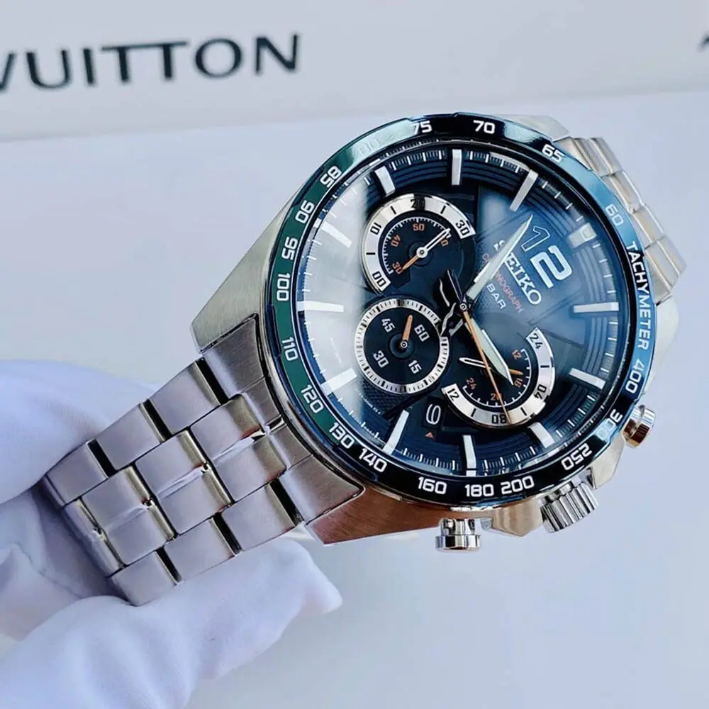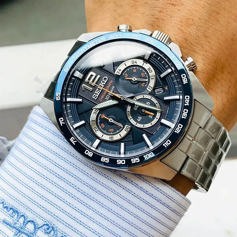 Seiko Chronograph SSB345P1 یه ساعت مردونهی اسپرتکلاسیک از کالکشن SPORT با طراحی صفحه آبی و قاب و بند فولاستیل بادوامه، موتور کوارتز دقیق و کرنوگراف سهزمانه داره. ضدآب تا ۱۰۰ متر، دارای تاچیمتر و تاریخنماست که هم برای استفاده روزمره و هم استایل رسمی مناسبش میکنه. ترکیب عملکرد دقیق، ظاهر جذاب و مقاوم بودن باعث انتخابی عالی برای ساعت روزمره میشه.